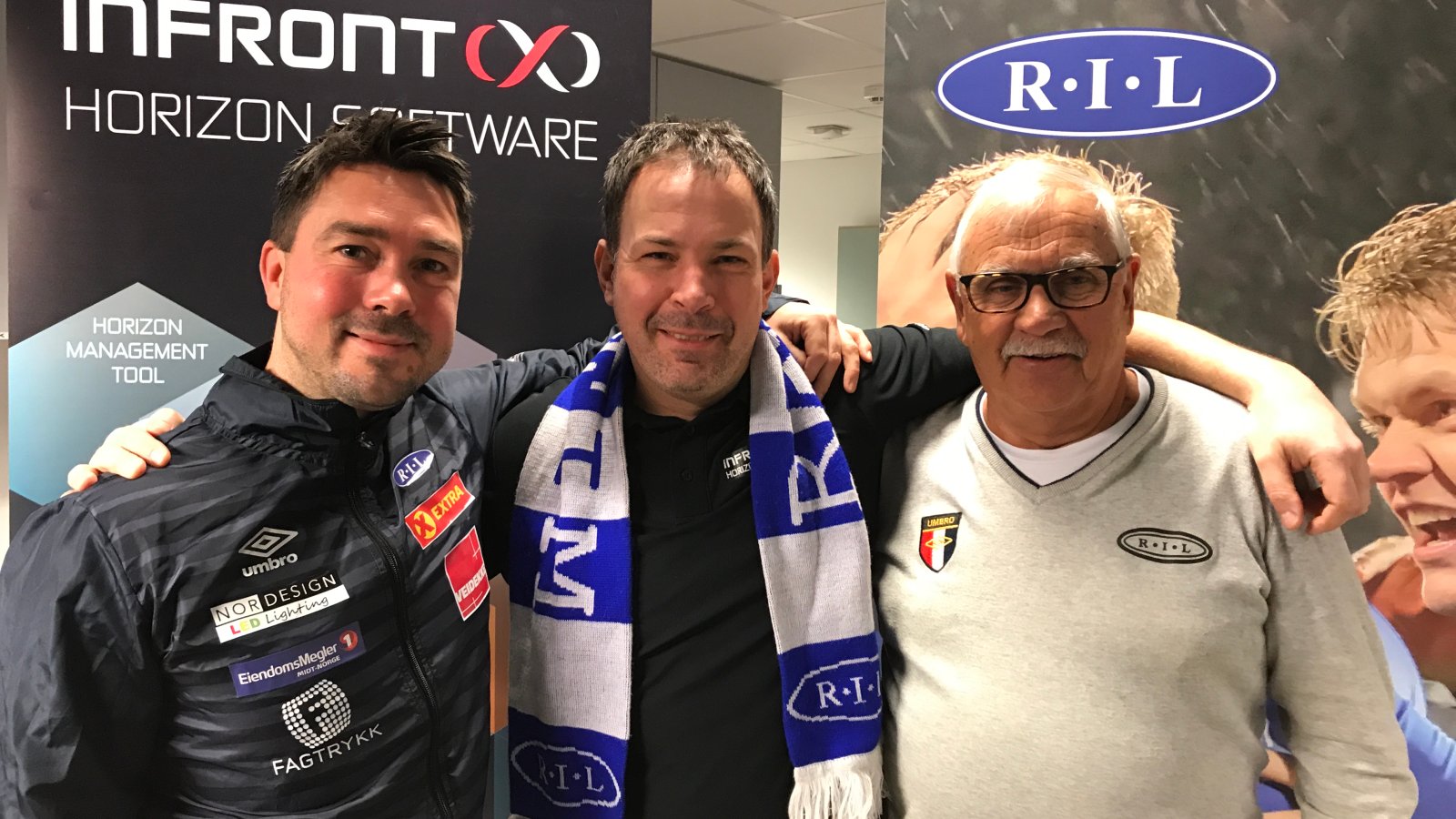 På bilde ser dere Peder Winsnes, Salg og markedsansvarlig Ranheim Fotball, Kevin Skarholt INFRONT-X og Roar Aune, støtteapparat for A- laget.