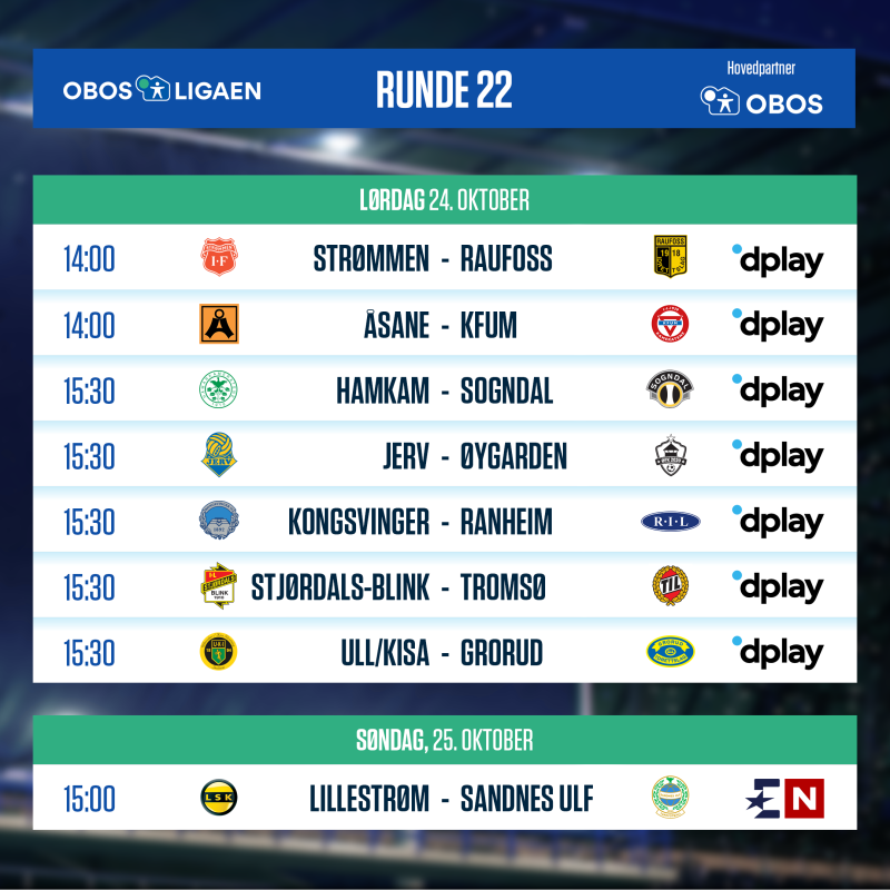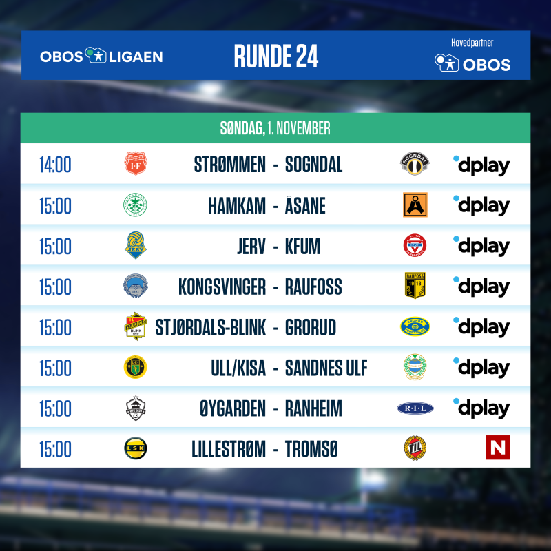 | Sandnes Ulf | - | Strømmen | Onsdag 1800 | Dplay |