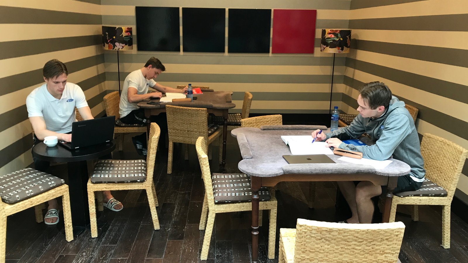 “Coffebreak”. Hotellet byr på et lite mellommåltid som kommer meget godt med. Kaffe og kake konsumeres med god samvittighet etter trening og skole. Dagens kake var litt for god, noe som gjør at undertegnede må bokføre tre kakestykker inn i dagens kaloriregnskap.
