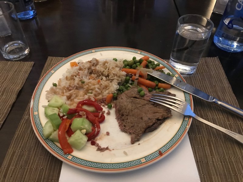 Middag. Liten opptur til middag når vi for første gang i løpet av oppholdet får servert rødt kjøtt. Biffen krevde dog god tyggekapasitet, men var absolutt noe av det bedre vi har fått servert her nede. Vi fikk forøvrig også feiret dagens bursdagsbarn, Svein Maalen, med sang og kake. Etter at kakestykket (nummer fire for dagen) var innabords sier jeg meg fornøyd med dagens kaloriinntak.
